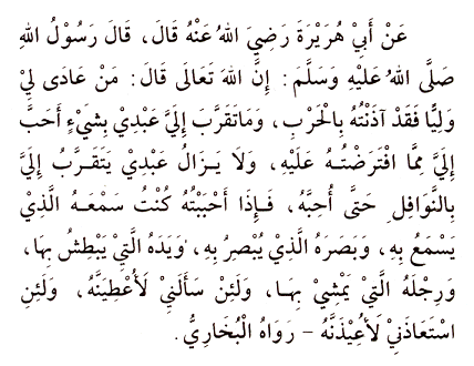 “Gjëja më e dashur me të cilën më afrohet robi im janë detyrimet që i kam caktuar. Ai vazhdon të më afrohet me vepra vullnetare (nafile) derisa Unë ta dua. E kur e kam dashur atë, pra, bëhem dëgjimi i tij me të cilin ai dëgjon, bëhem shikimi i tij me të cilin ai shikon; bëhem gjuha e tij me të cilën ai flet, bëhem dora e tij me të cilën ai mban, bëhem këmba e tij me të cilën ai ecë. Në qoftë se do të më pyeste për diçka, vërtet do t’ia jepja atë. E nëse do të kërkonte mbrojtje preje Meje, sigurisht do t’i jepja atij”.