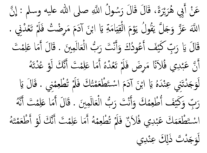 Hazret Ebu Hurejra r.a. transmeton se i Dërguari i Allahut s.a.s. tha se në ditën e kiametit Allahu do të thotë, “O biri i Ademit! Unë kam qenë i sëmurë, përse nuk më vizitove? Ai do të përgjigjet ‘Si është i mundur që të sëmuresh Ti, kur Ti je Zot i gjithësisë?’ Allahu do t’i përgjigjet ‘A nuk e ke ditur se filan robi im ka qenë i sëmurë dhe ti nuk e vizitove? Po ta kishe vizituar atë, do të Më kishe gjetur pranë tij.’ ‘O biri i Ademit! Unë kisha kërkuar ushqim prej teje, por ti Më refuzove’. Ai do të përgjigjet, ‘O Zoti im, si të kisha ushqyer unë Ty, kur Ti je Zoti i gjithësisë? Allahu do t’i përgjigjet ‘A nuk të erdhi filan rob Imi, por ti e refuzove ta ushqeje? Po ta kishte ushqyer, do të konsideroja sikur të më kishe ushqyer Mua.”