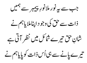 d.m.th. që kur kemi zbuluar këtë dritë nga hijeshia e Pejgamberit s.a.v.s., jemi lidhur me qenien e Zotit, të vërtetin absolut. O Profet! Virtytet e tua të larta rrezatojnë madhështinë e Zotit dhe kemi zbuluar Zotin vetëm pasi që u njohëm me ty.