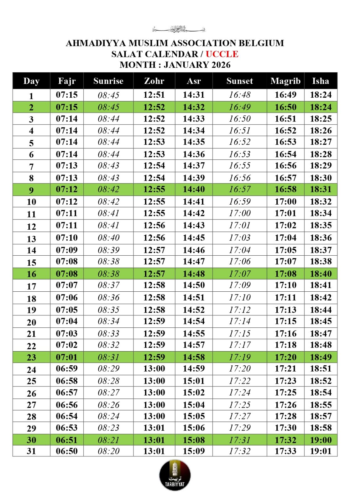 Salaturen Januari 2026 – Horaires des prières Janvier 2026