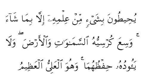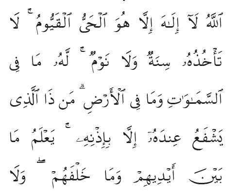 “Al’lah: no hay mas Dios que Él, el Viviente, el que Subsiste por Sí mismo y sostiene todo. No se apoderan de Él ni el sopor ni el sueño. A Él pertenece cuanto hay en los cielos y cuanto hay en la tierra. ¿Quién es capaz de interceder ante Él si no es con Su permiso? Él conoce lo que está delante y detrás de ellos; y ellos no abarcan nada de Su ciencia, salvo lo que Él quiere. Su Trono se extiende sobre los cielos y la tierra; y su cuidado no le supone preocupación alguna; y Él es el Altísimo, el Grande.” [1]
