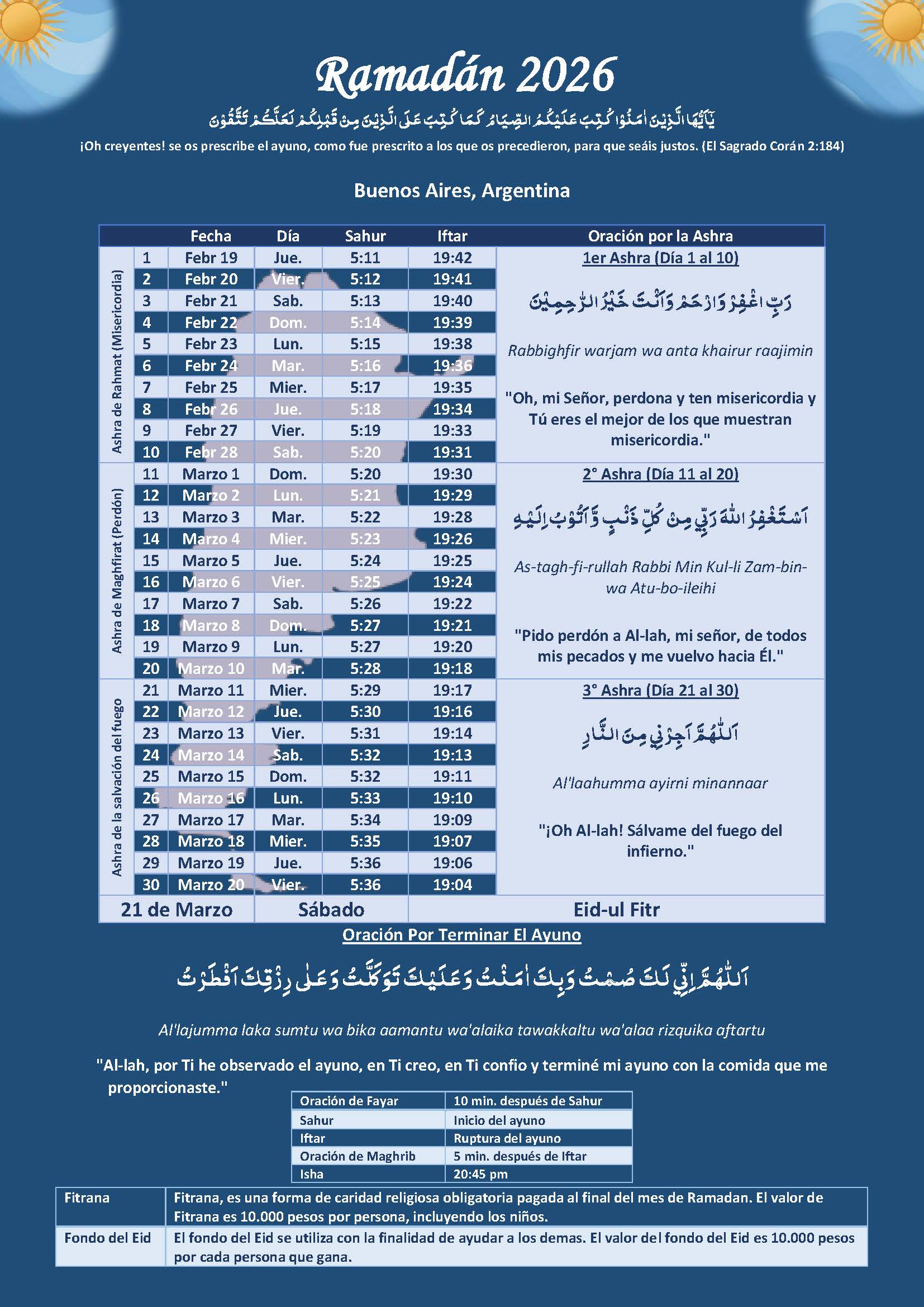 Calendario Ramadán 2026 – ¡La Comunidad Musulmana Ahmadía le felicita cordialmente por el bendito mes de Ramadán! ¡Que Dios acepte su ayuno, adoración, obras y oraciones y le otorgue su aprobación y cercanía a Él! Amén