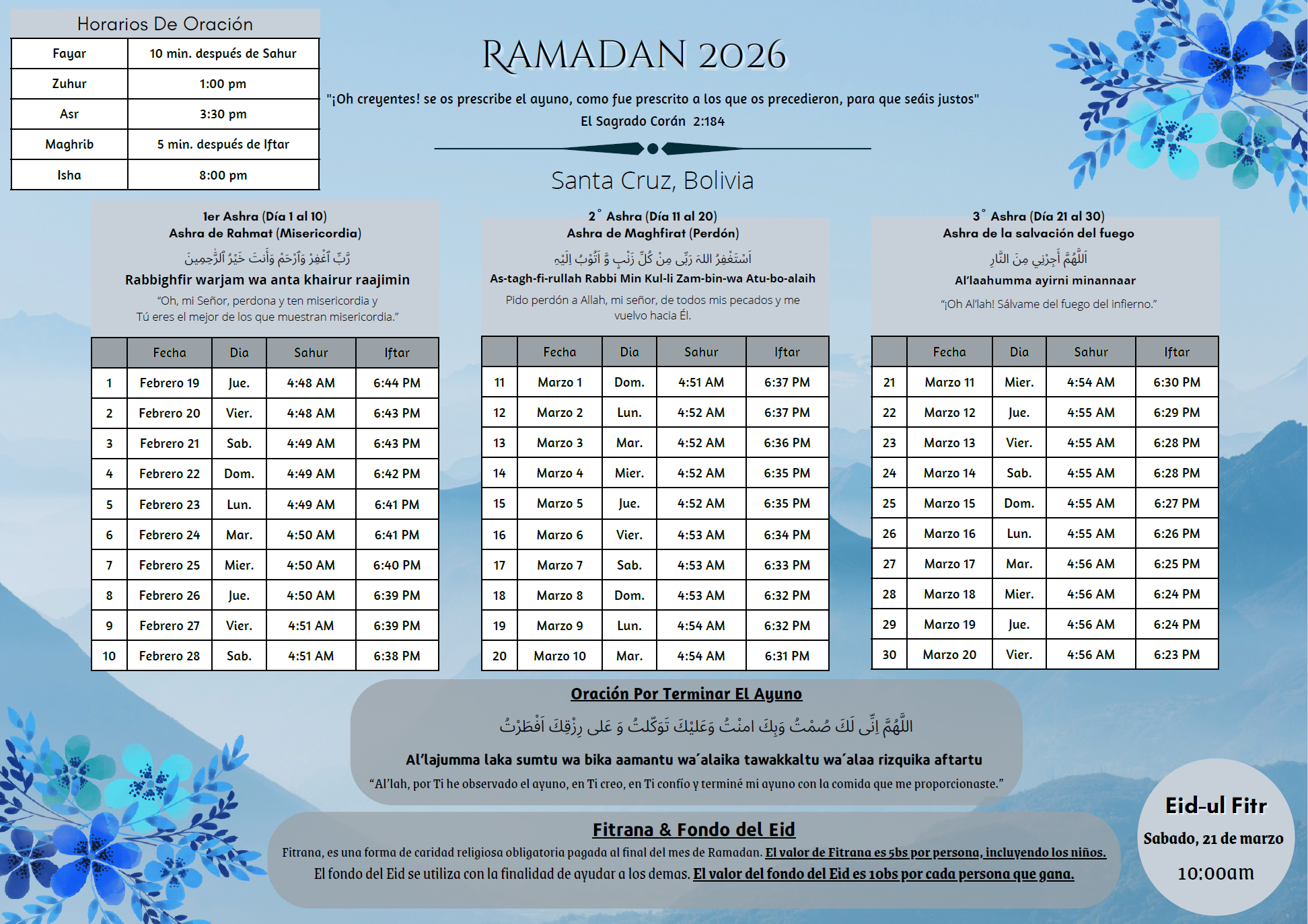 Calendario Ramadán 2026 – ¡La Comunidad Musulmana Ahmadía le felicita cordialmente por el bendito mes de Ramadán! ¡Que Dios acepte su ayuno, adoración, obras y oraciones y le otorgue su aprobación y cercanía a Él! Amén