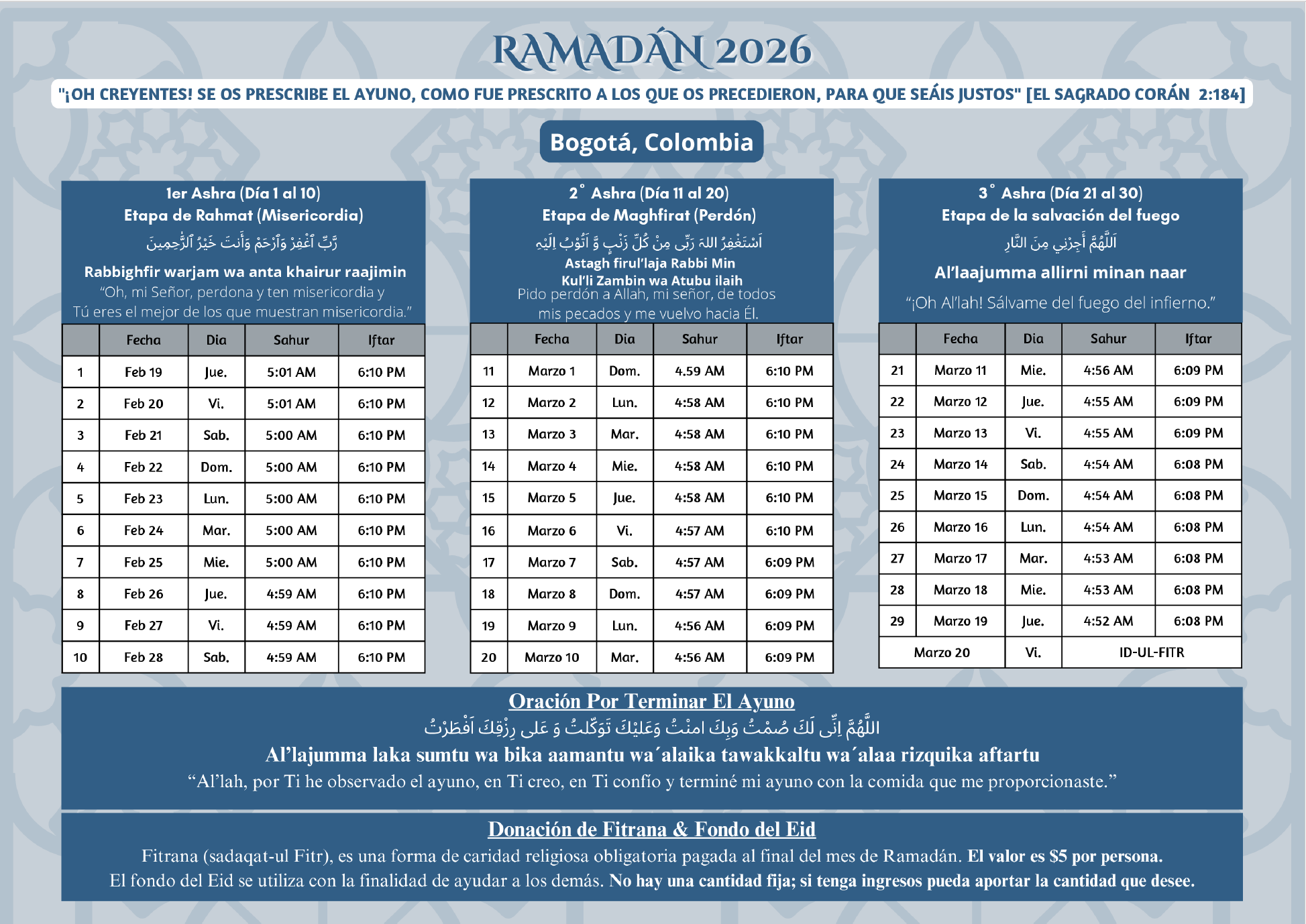 Calendario Ramadán 2026 – ¡La Comunidad Musulmana Ahmadía le felicita cordialmente por el bendito mes de Ramadán! ¡Que Dios acepte su ayuno, adoración, obras y oraciones y le otorgue su aprobación y cercanía a Él! Amén