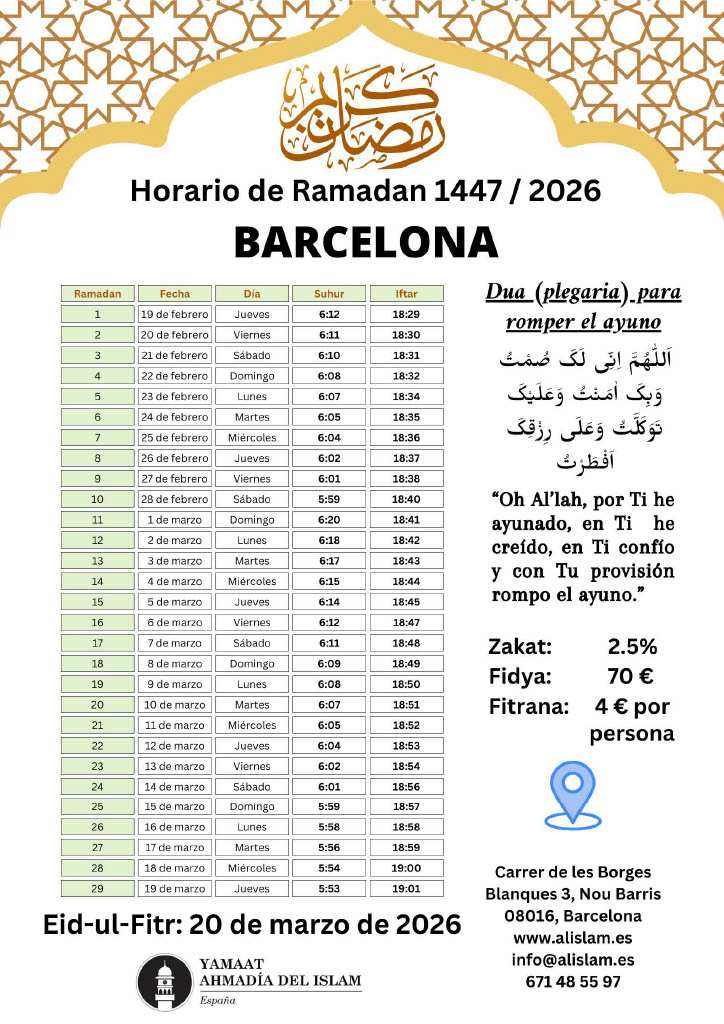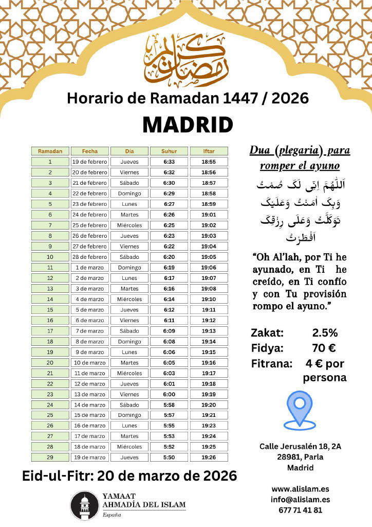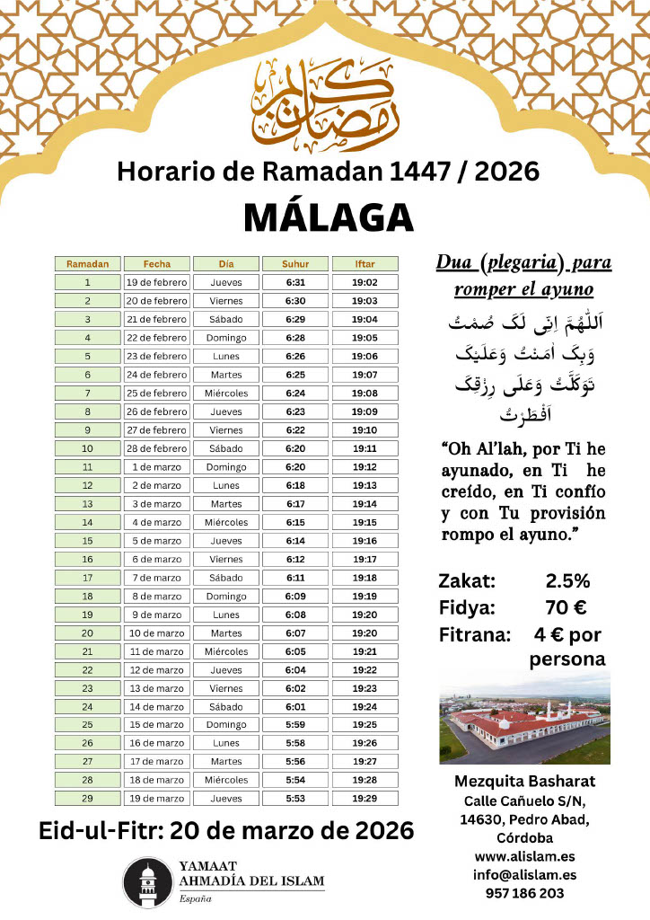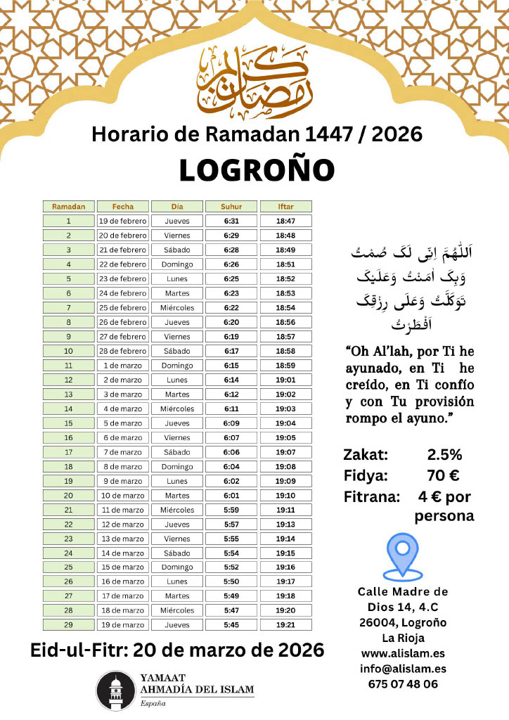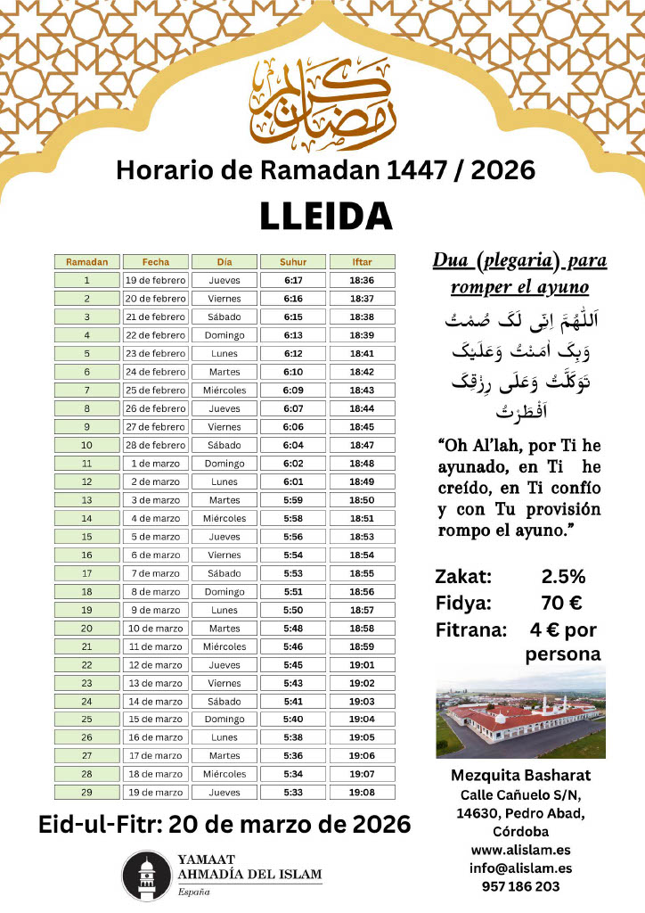 Calendario Ramadán 2026 – ¡La Comunidad Musulmana Ahmadía le felicita cordialmente por el bendito mes de Ramadán! ¡Que Dios acepte su ayuno, adoración, obras y oraciones y le otorgue su aprobación y cercanía a Él! Amén