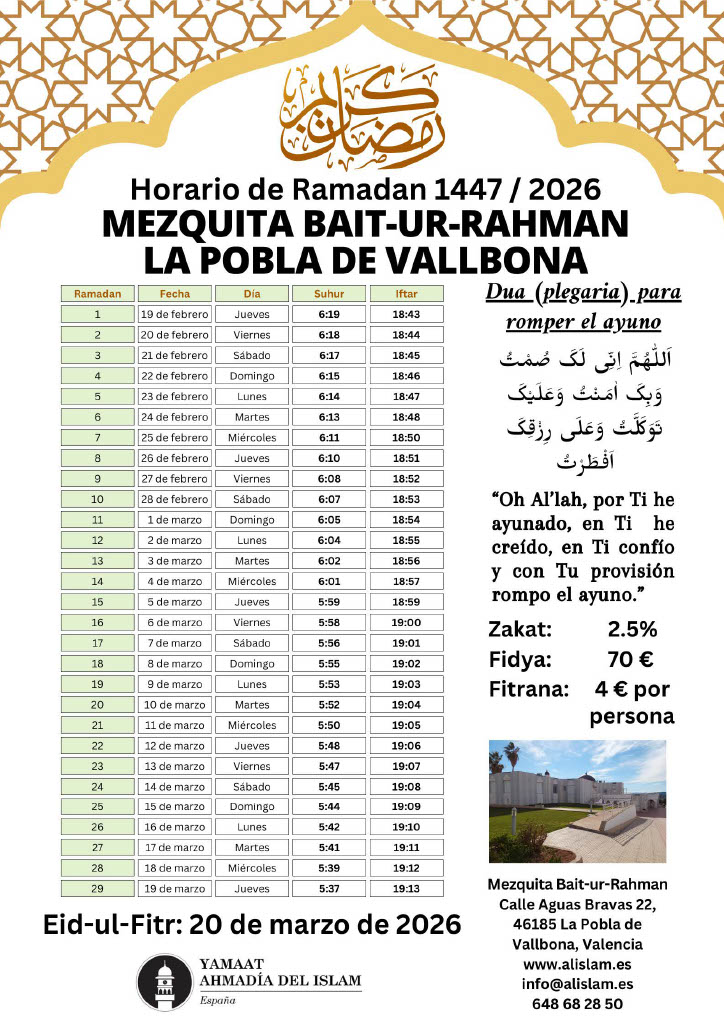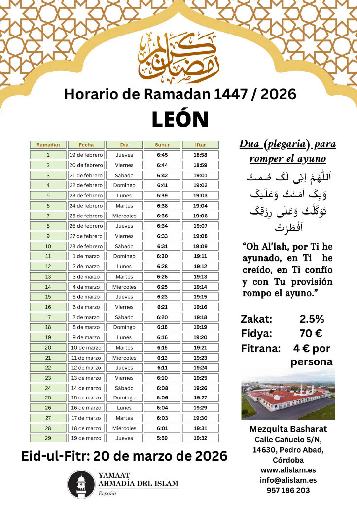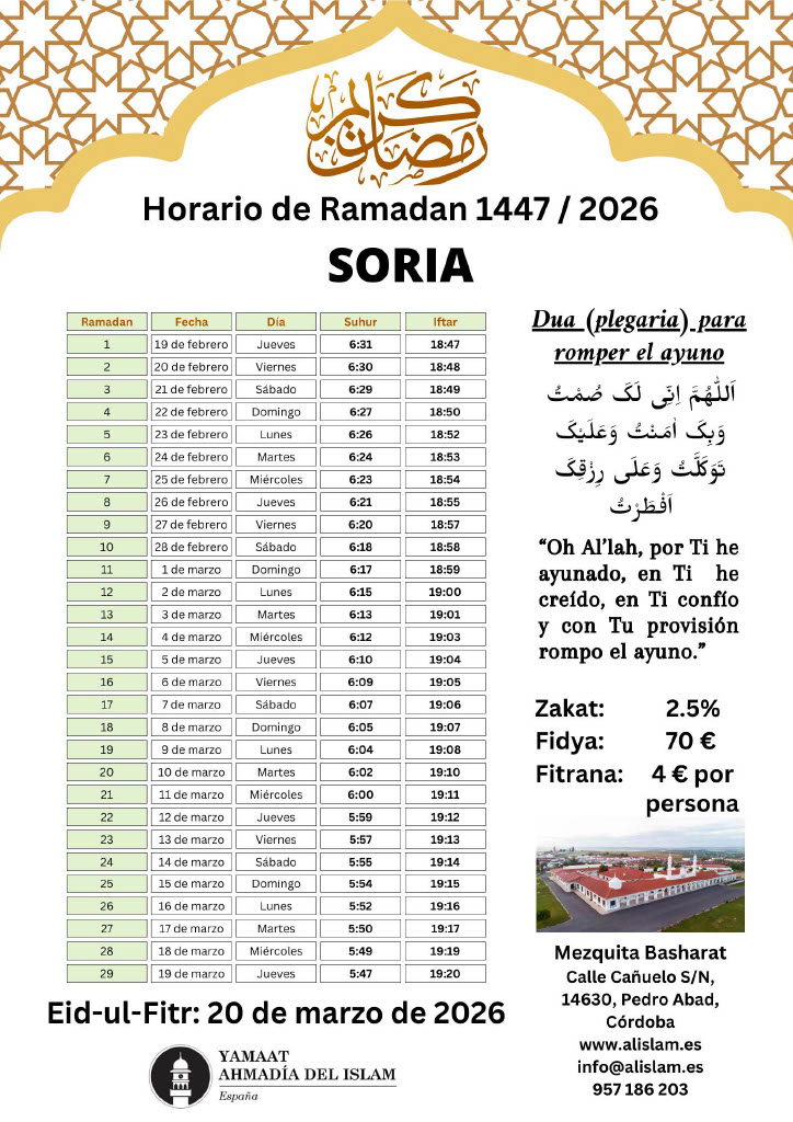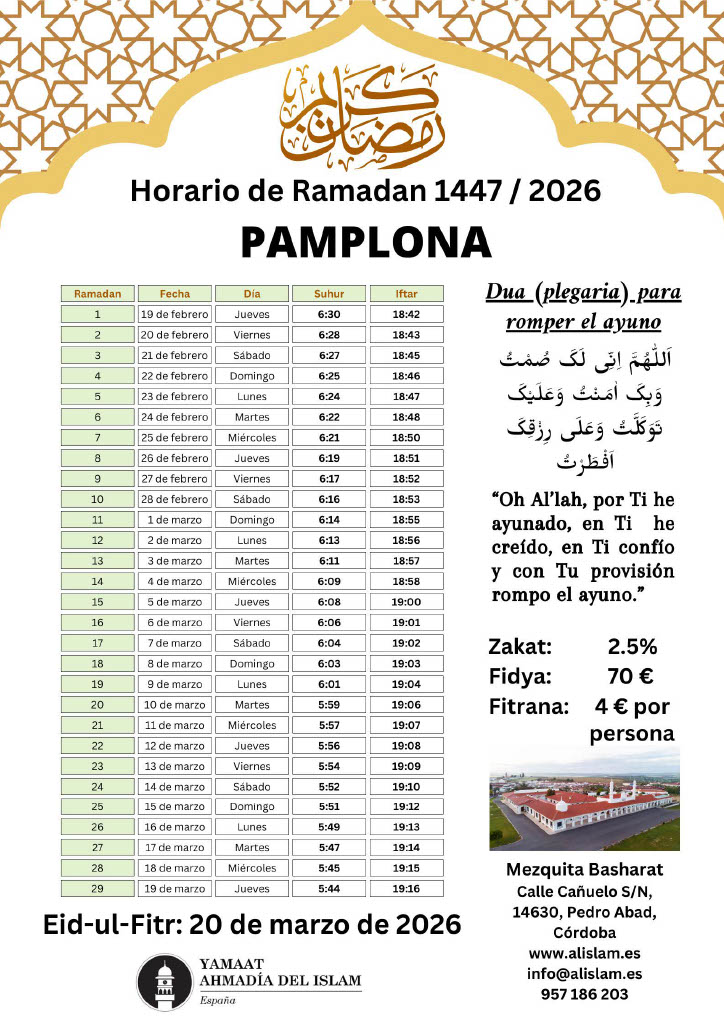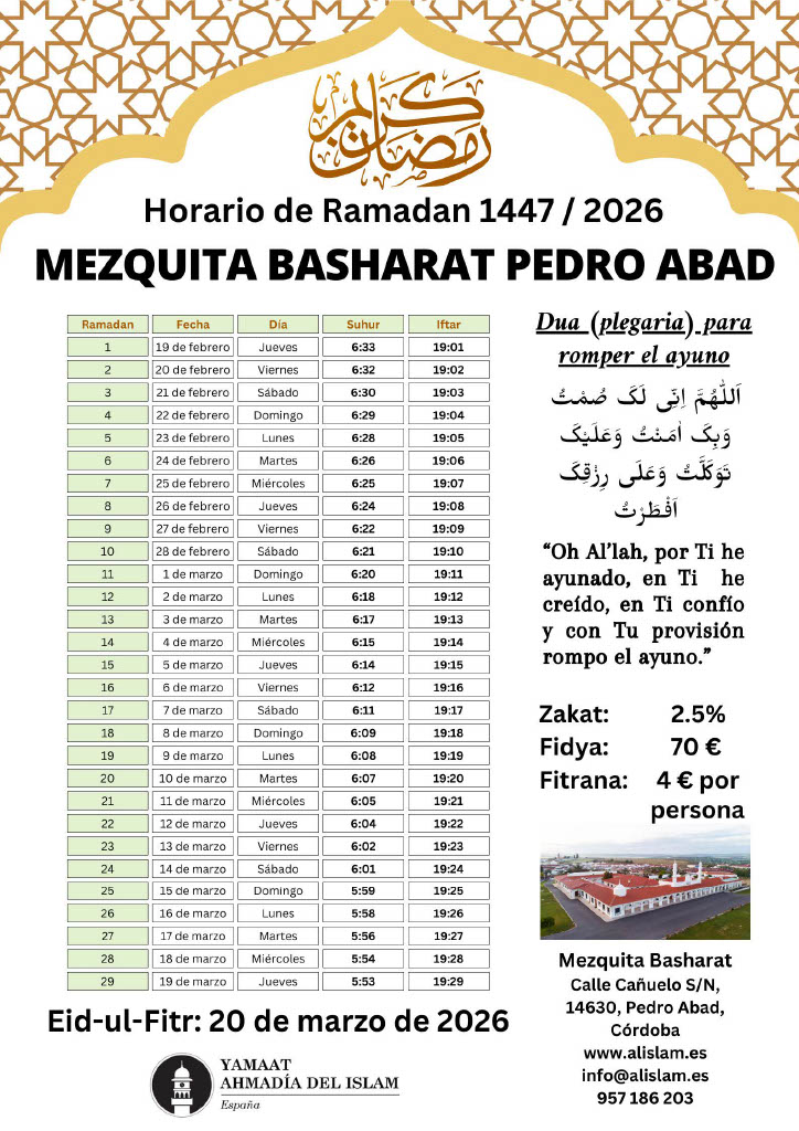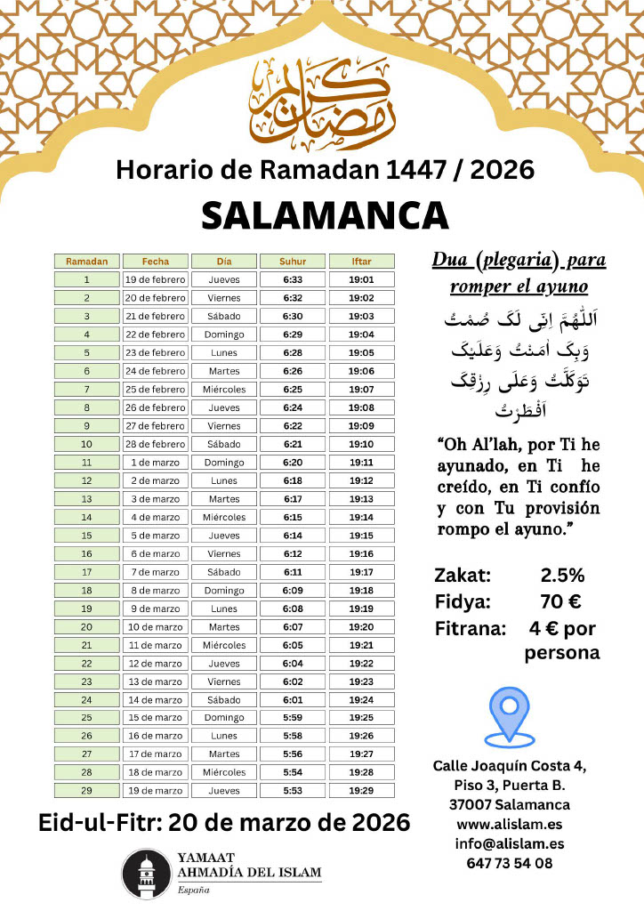 Calendario Ramadán 2026 – ¡La Comunidad Musulmana Ahmadía le felicita cordialmente por el bendito mes de Ramadán! ¡Que Dios acepte su ayuno, adoración, obras y oraciones y le otorgue su aprobación y cercanía a Él! Amén