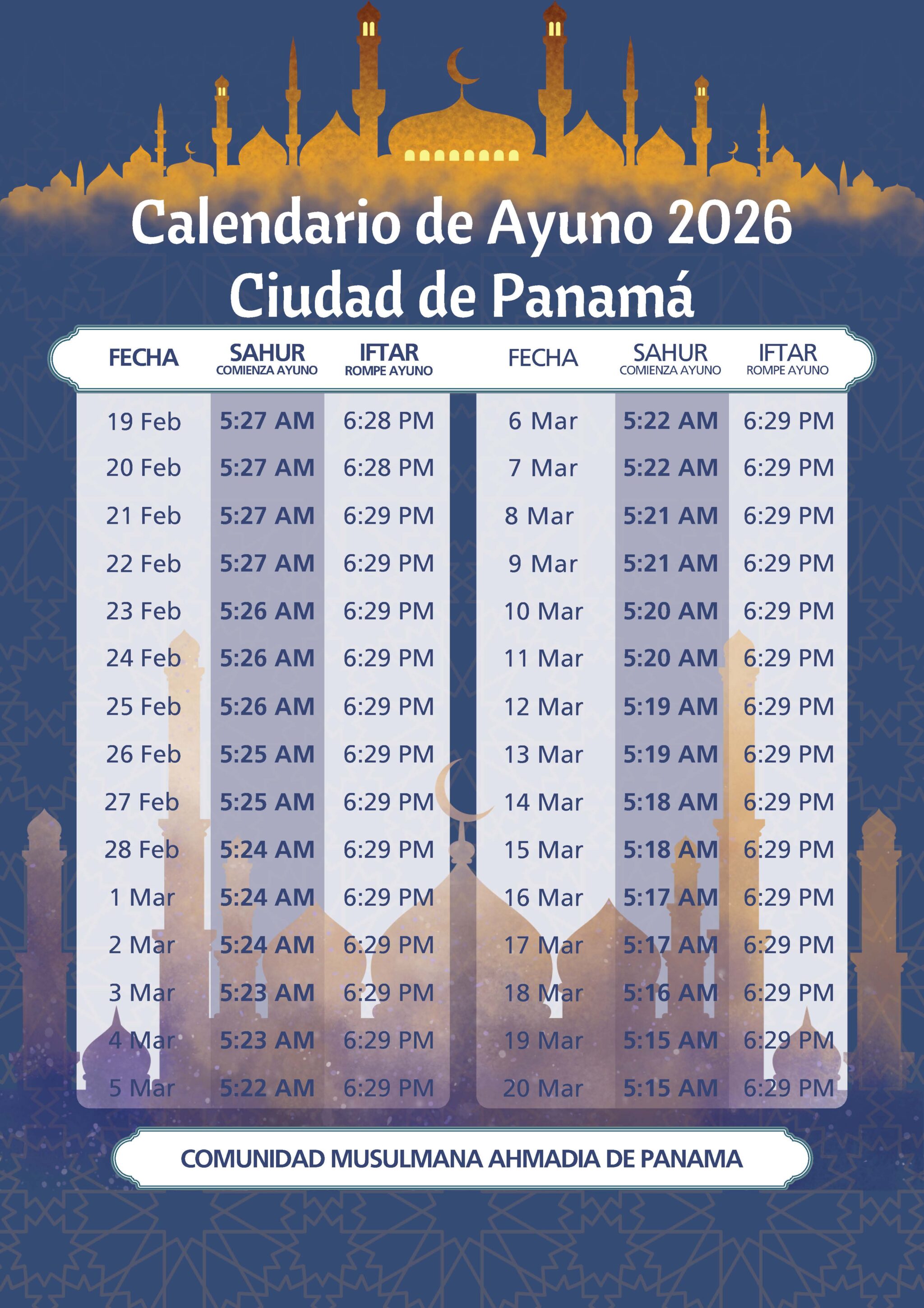 Calendario Ramadán 2026 – ¡La Comunidad Musulmana Ahmadía le felicita cordialmente por el bendito mes de Ramadán! ¡Que Dios acepte su ayuno, adoración, obras y oraciones y le otorgue su aprobación y cercanía a Él! Amén