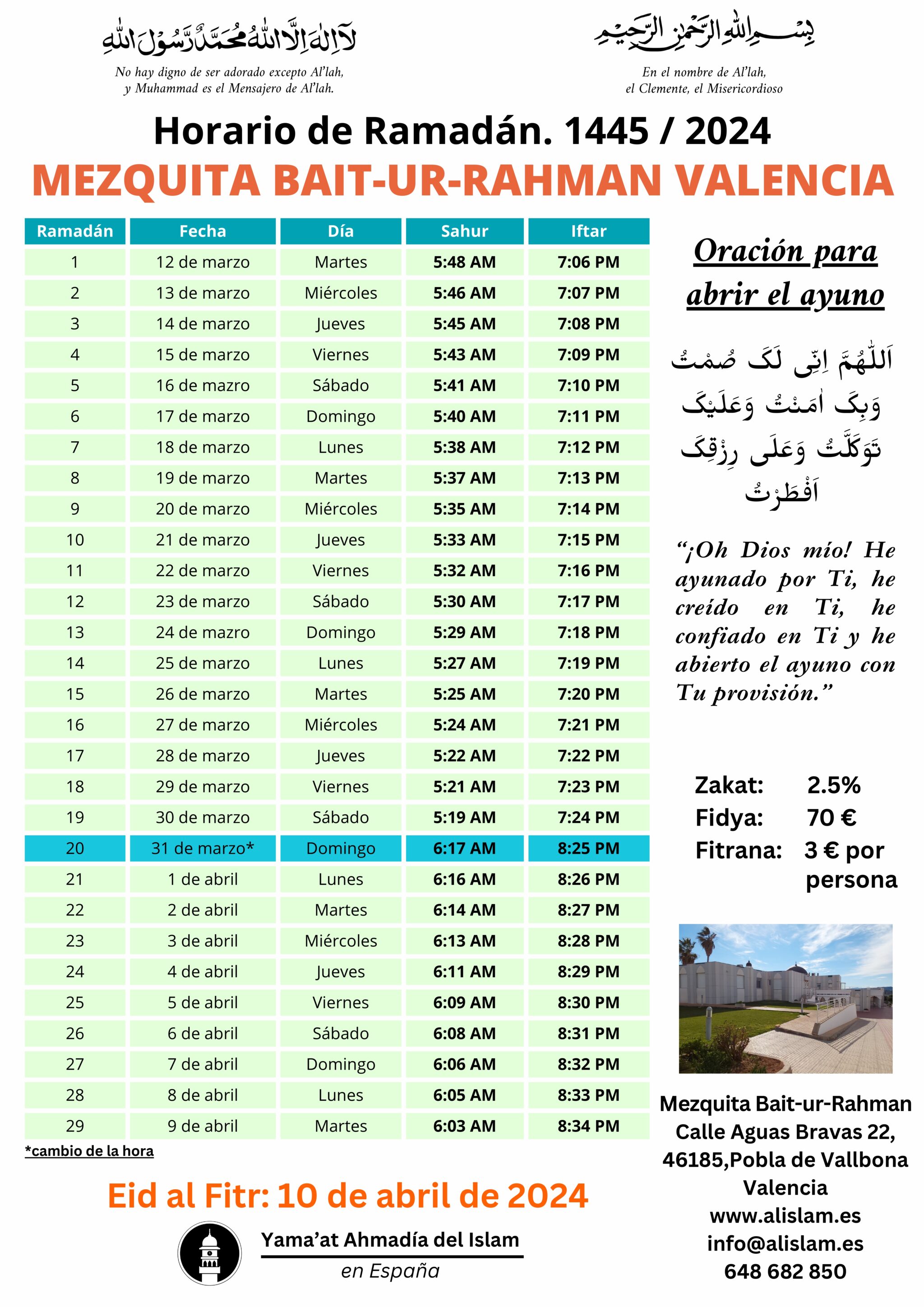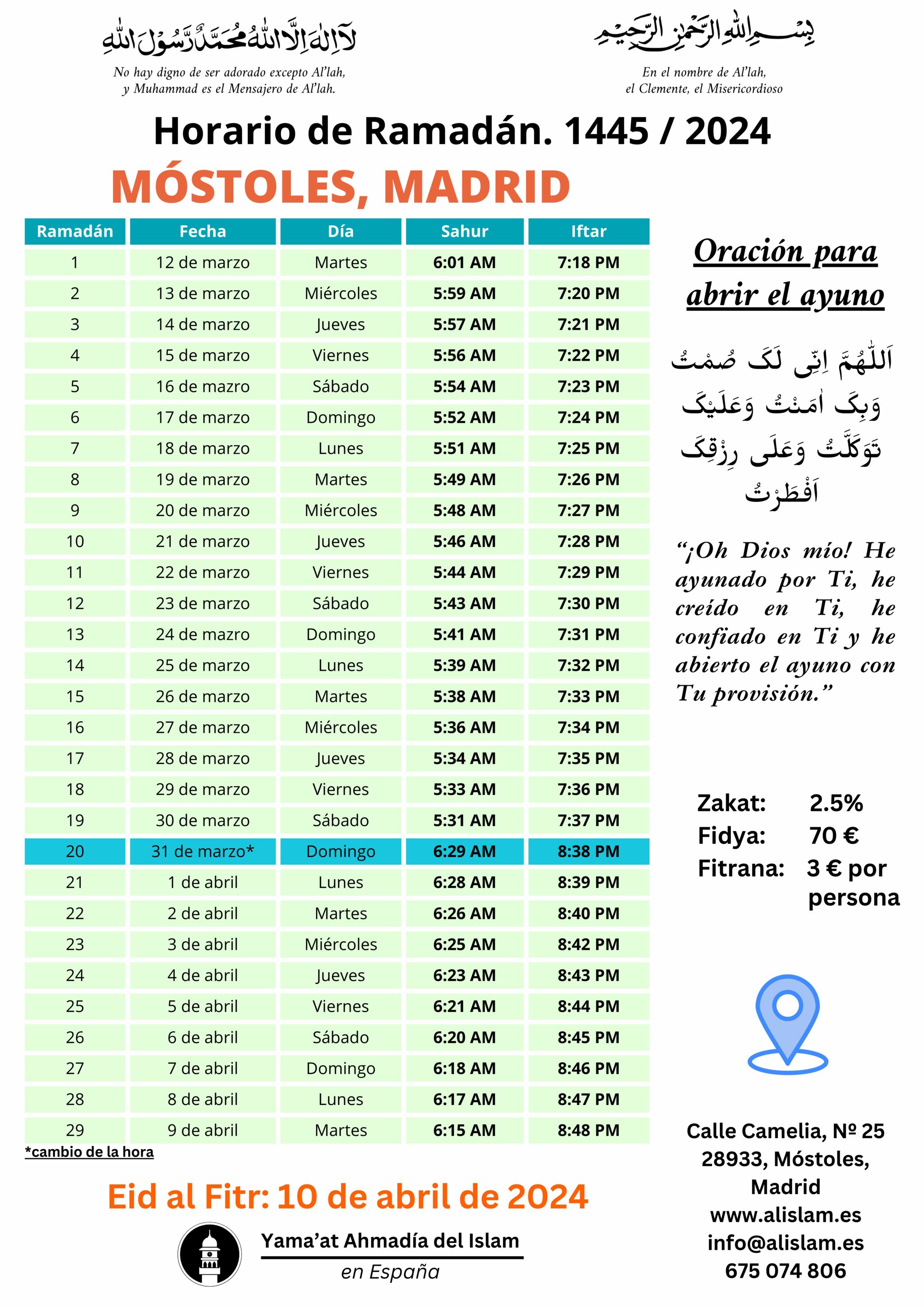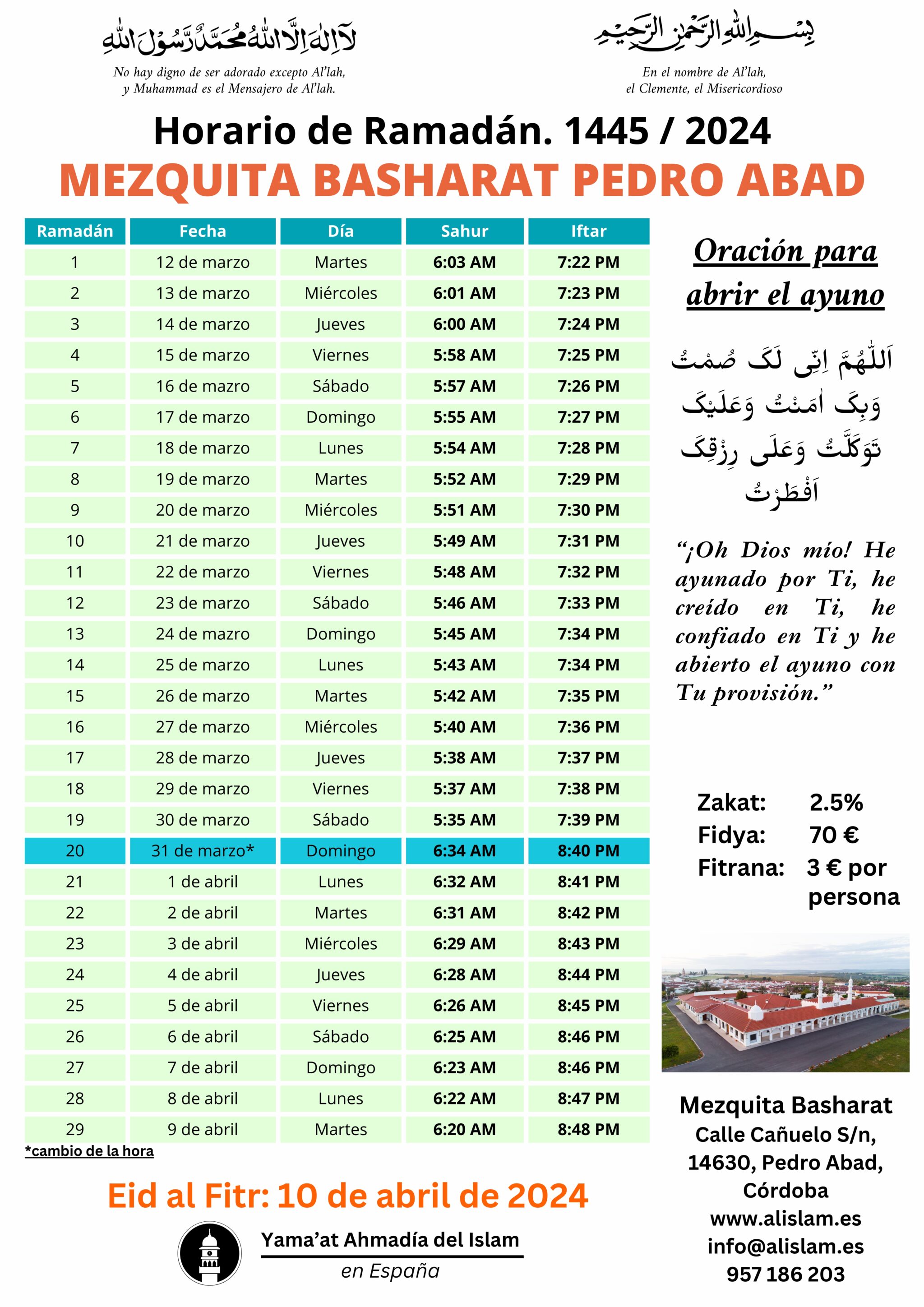Calendario Ramadán 2024 – ¡La Comunidad Musulmana Ahmadía le felicita cordialmente por el bendito mes de Ramadán! ¡Que Dios acepte su ayuno, adoración, obras y oraciones y le otorgue su aprobación y cercanía a Él! Amén