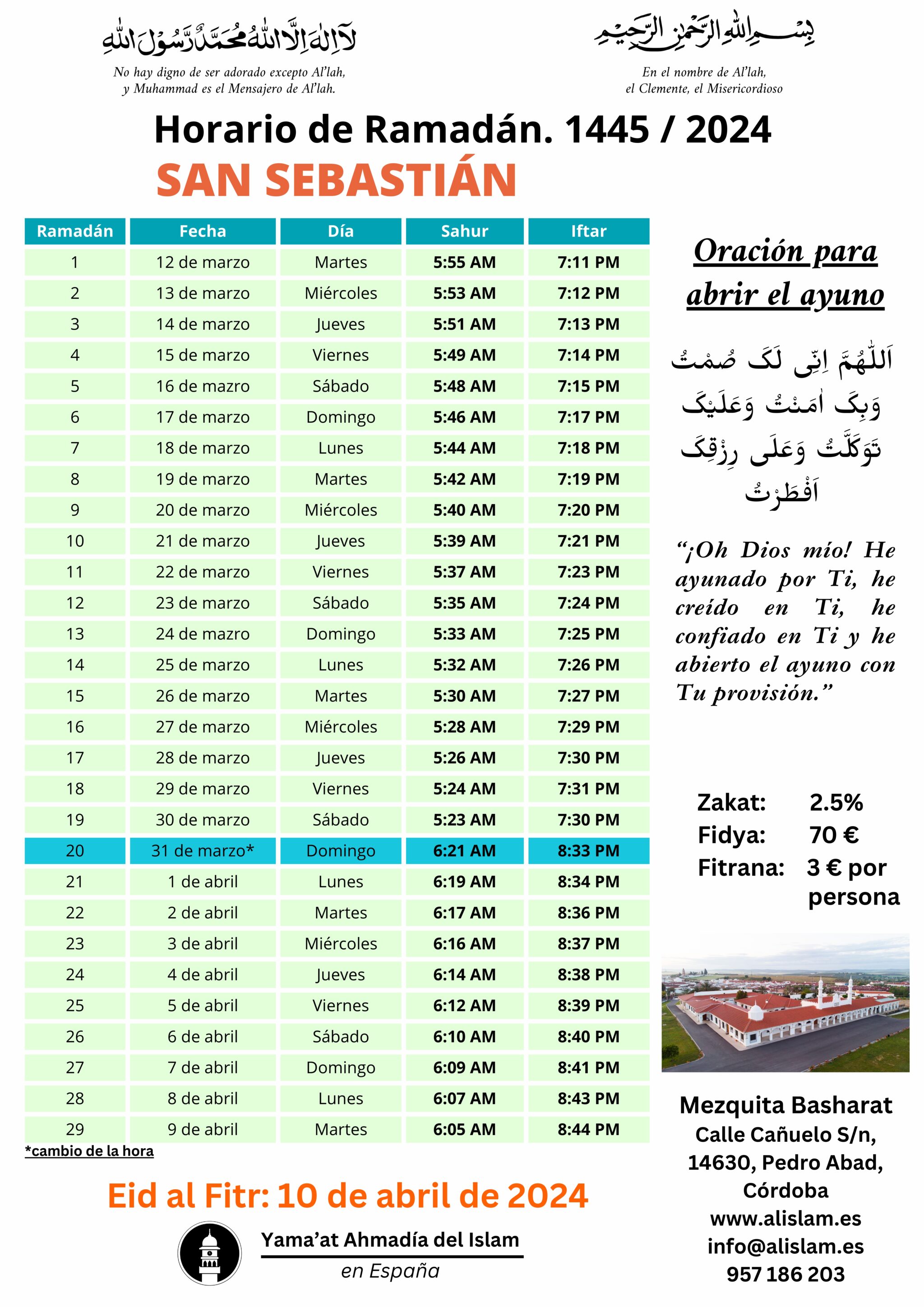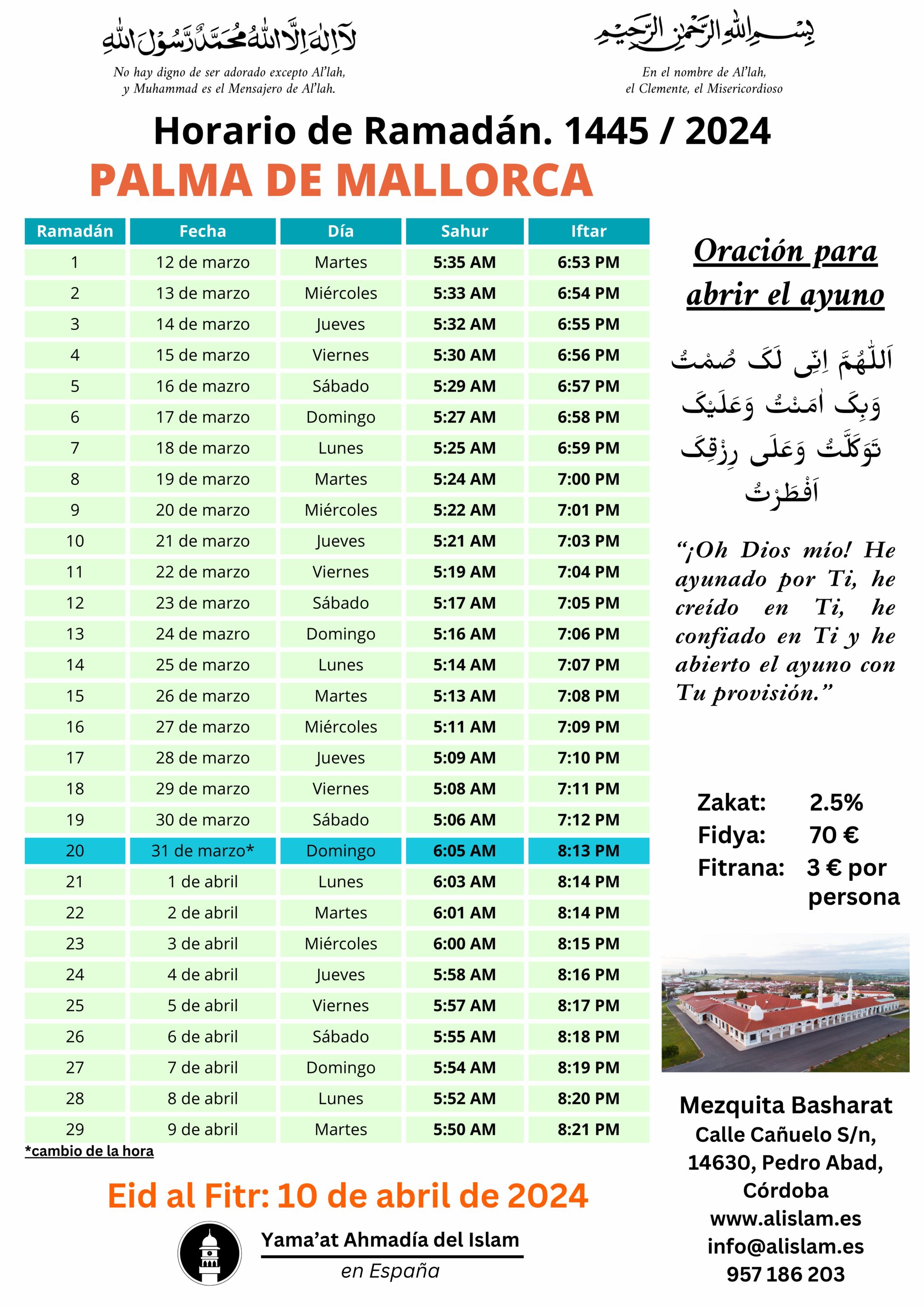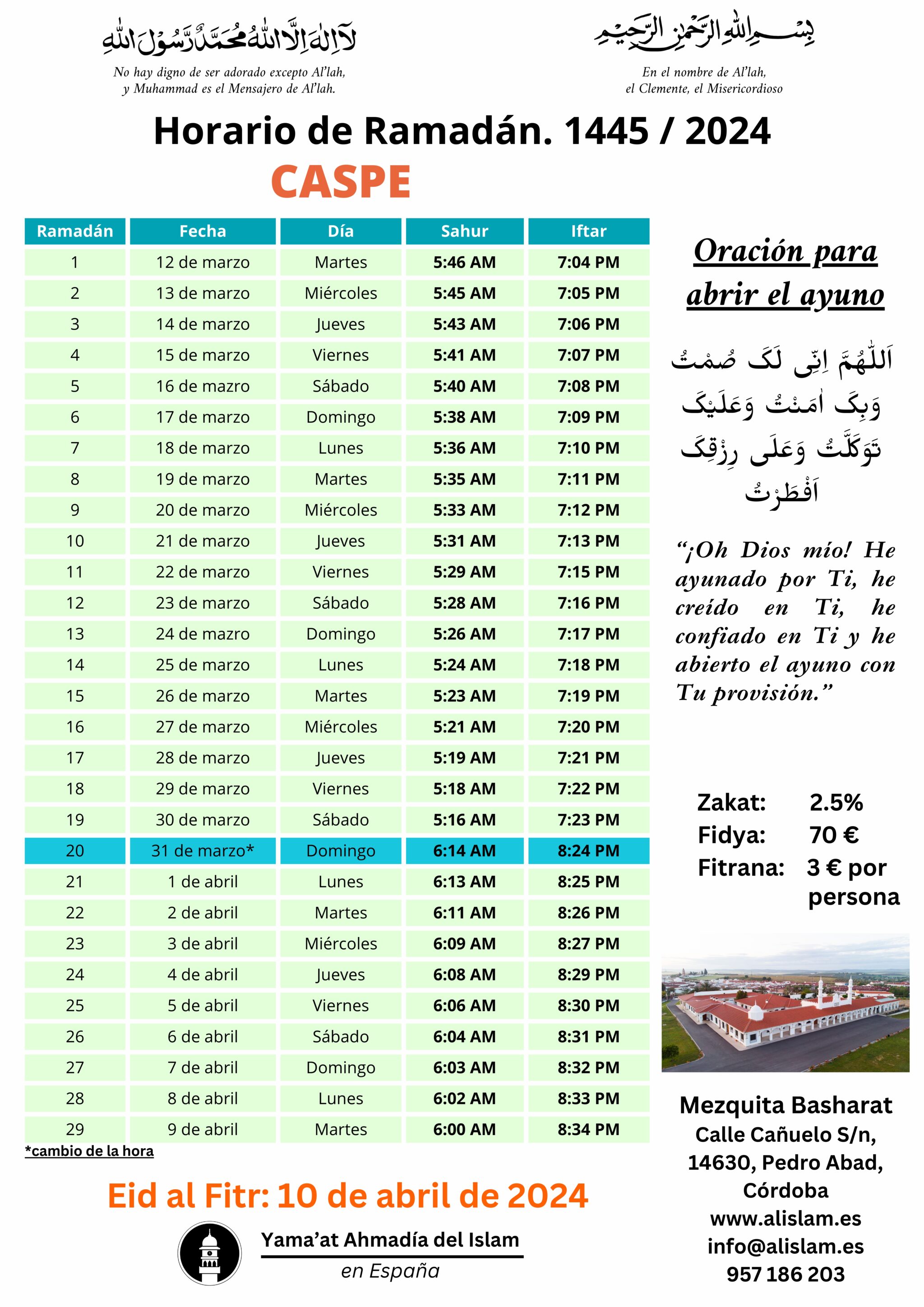 Calendario Ramadán 2024 – ¡La Comunidad Musulmana Ahmadía le felicita cordialmente por el bendito mes de Ramadán! ¡Que Dios acepte su ayuno, adoración, obras y oraciones y le otorgue su aprobación y cercanía a Él! Amén