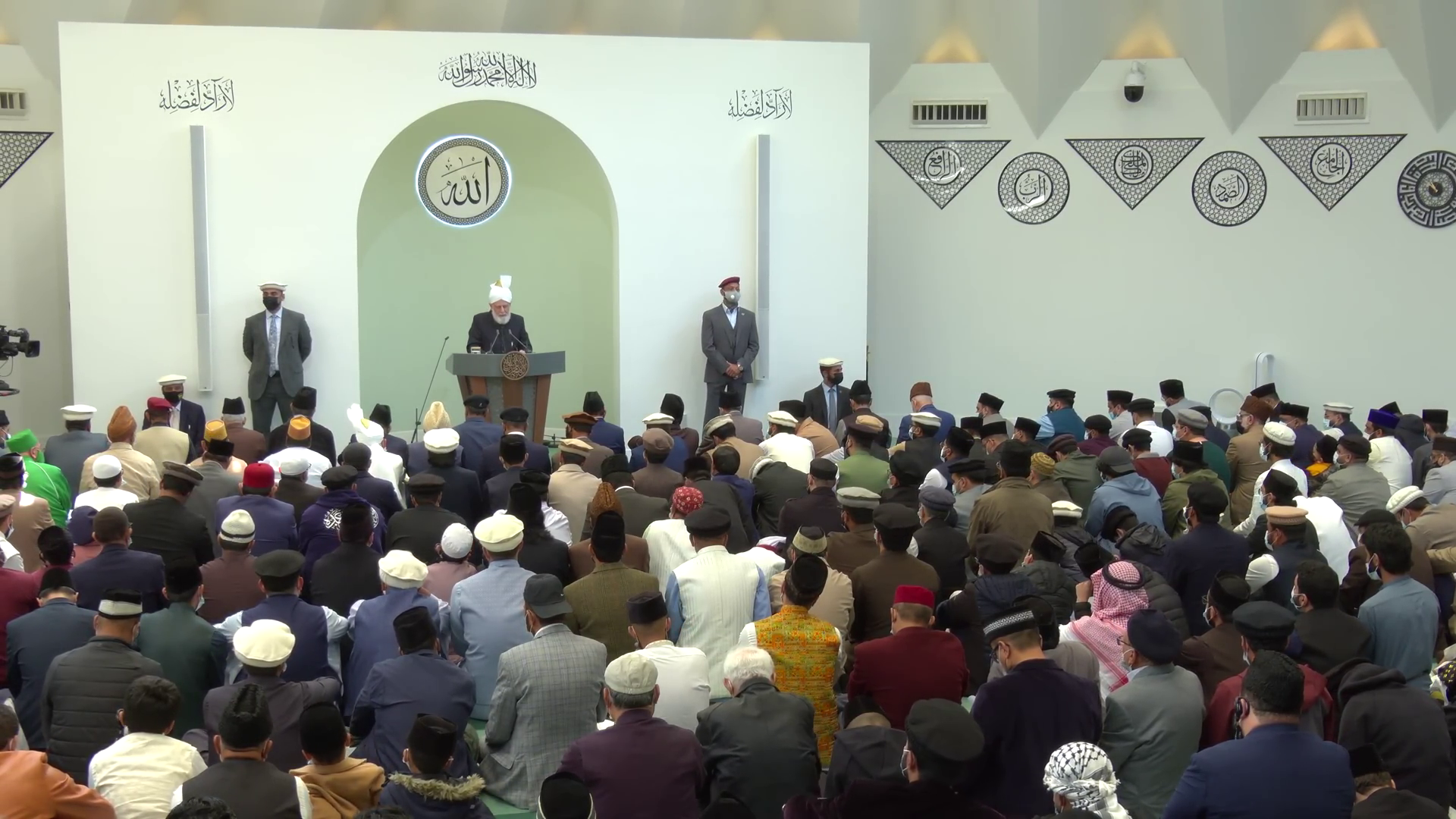 Después de recitar el Tashahud, Taawuz y Surah Al-Fatihah, Su Santidad, el Jalifa V del Mesías (aba) dijo: