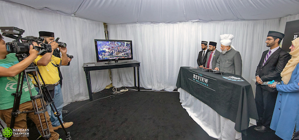 Fue en aquel momento, al final de la inauguración del hospital, cuando Su Santidad se encaminó hacia la carpa donde tendría lugar una rueda de prensa para establecer otro hito en la historia de la Comunidad Musulmana Ahmadía. Presionando el botón rojo en un Ipad, Su Santidad realizó el lanzamiento oficial de la nueva edición en español de The Review of Religions – la revista iniciada por Su Santidad Mirza Ghulam Ahmad (as), quien declaró ser el Mesías Prometido, el Imam Mahdi y el Reformador Prometido, cuyo advenimiento en los últimos días había sido profetizado por las principales religiones.
