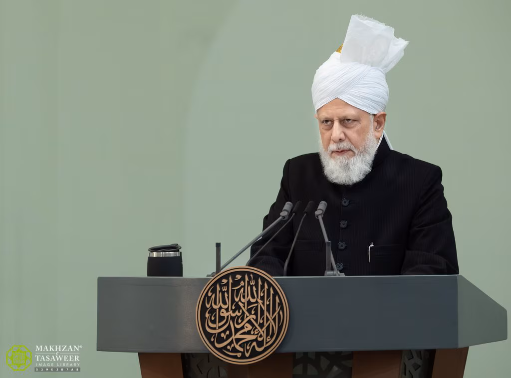 El líder mundial de la Comunidad Musulmana Ahmadía, el Jalifa V del Mesías, Su Santidad, Hazrat Mirza Masroor Ahmad, pronunció el sermón del Eid-ul-Fitr el 31 de marzo de 2025 desde la Mezquita Mubarak en Islamabad, Tilford.