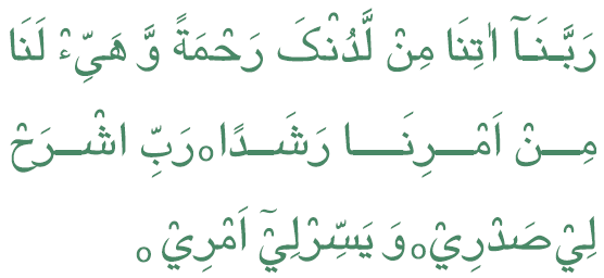 Rabbanaa aa-tinaa milladunka rahmatanw-wa hayyi ‘la-naa min amrinaa rasha-daa. Rabbish-rahlee sadree wa yassir-lee amree.