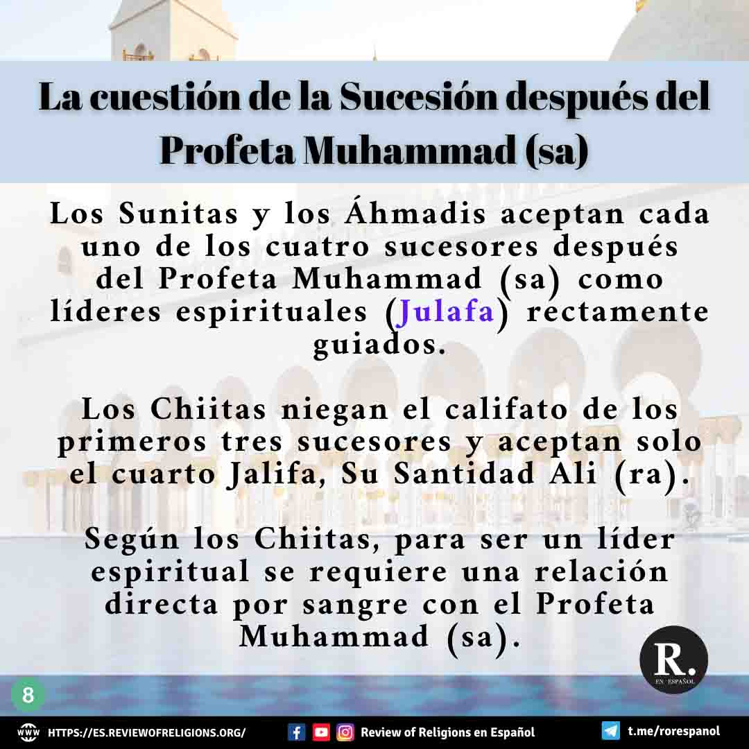 Lo principal que los divide es la aceptación o el rechazo de los sucesores que aparecieron después del Profeta Muhammad (sa). Los suníes aceptan los cuatro sucesores (Abu Bakr, Umar, Usman y Alí) como veraces y legítimos, mientras que los chiítas sólo aceptan a Alí.