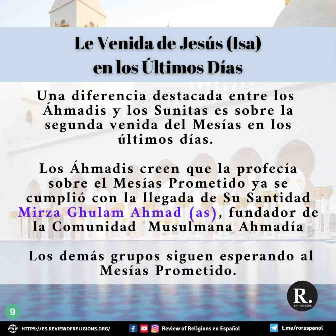 Aparte de los suníes y los chiítas, el tercer grupo más grande y de más rápido crecimiento es la Comunidad Musulmana Ahmadía. La principal diferencia entre los áhmadis y otros grupos es su creencia en Mirza Ghulam Ahmad (as) como el Mesías Prometido. Los textos islámicos hablan de la llegada de un reformador en los últimos días. Muchos musulmanes creen que este reformador es Jesús, hijo de María. Sin embargo, los áhmadis creen que Jesús ha fallecido y que las profecías se refieren a la llegada de un reformador al que se le concedería el título de Jesús por su similitud con él. Los áhmadis también creen que la venida del Imam Mahdi, otra figura escatológica, se cumplió también en Mirza Ghulam Ahmad (as), y que no aparecerían dos figuras separadas. La venida del Dayyal, o Anticristo, tampoco fue literal, sino que se refería a los poderes cristianos de la época y otras influencias corrosivas, como las filosofías modernas, que eran extremadamente perjudiciales para la fe de los musulmanes comunes.
