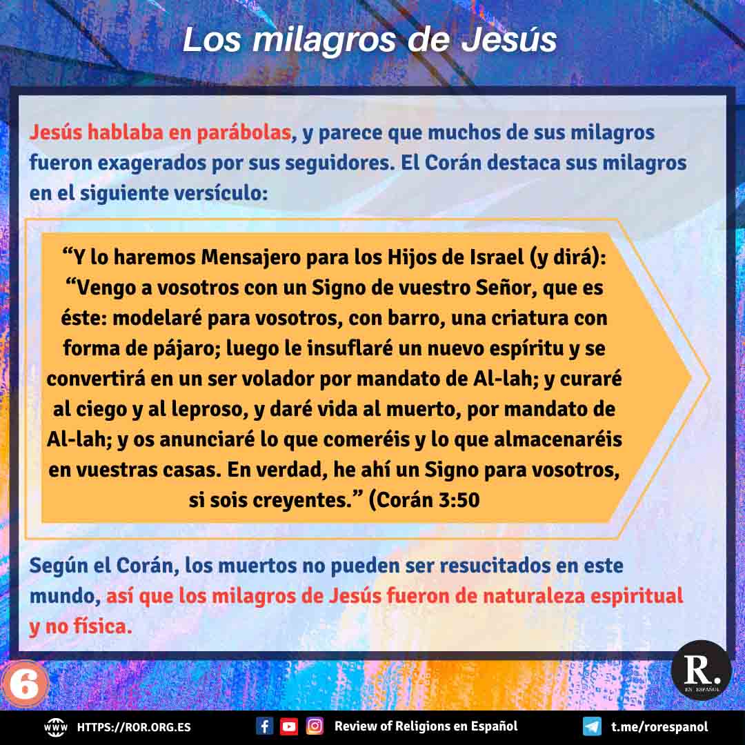 El Corán habla acerca de los milagros de Jesús. Dice que formaba pájaros de barro y les hacía volar, curaba los ciegos y leprosos, y daba vida a los muertos (3:50). Esto es lenguaje metafórico y refieren a curar los que fueron leprosos y ciegos espiritualmente, y que daba vida a los que fueron muertos espiritualmente. En cualquier caso, Jesús mismo afirmó que todos sus milagros fueron hechos por el poder de Dios, y no su propio poder (Juan 5:30). El Corán aclara que Jesús era el mensajero de Dios, pero no era Dios mismo y que no hay una Trinidad (4:172).