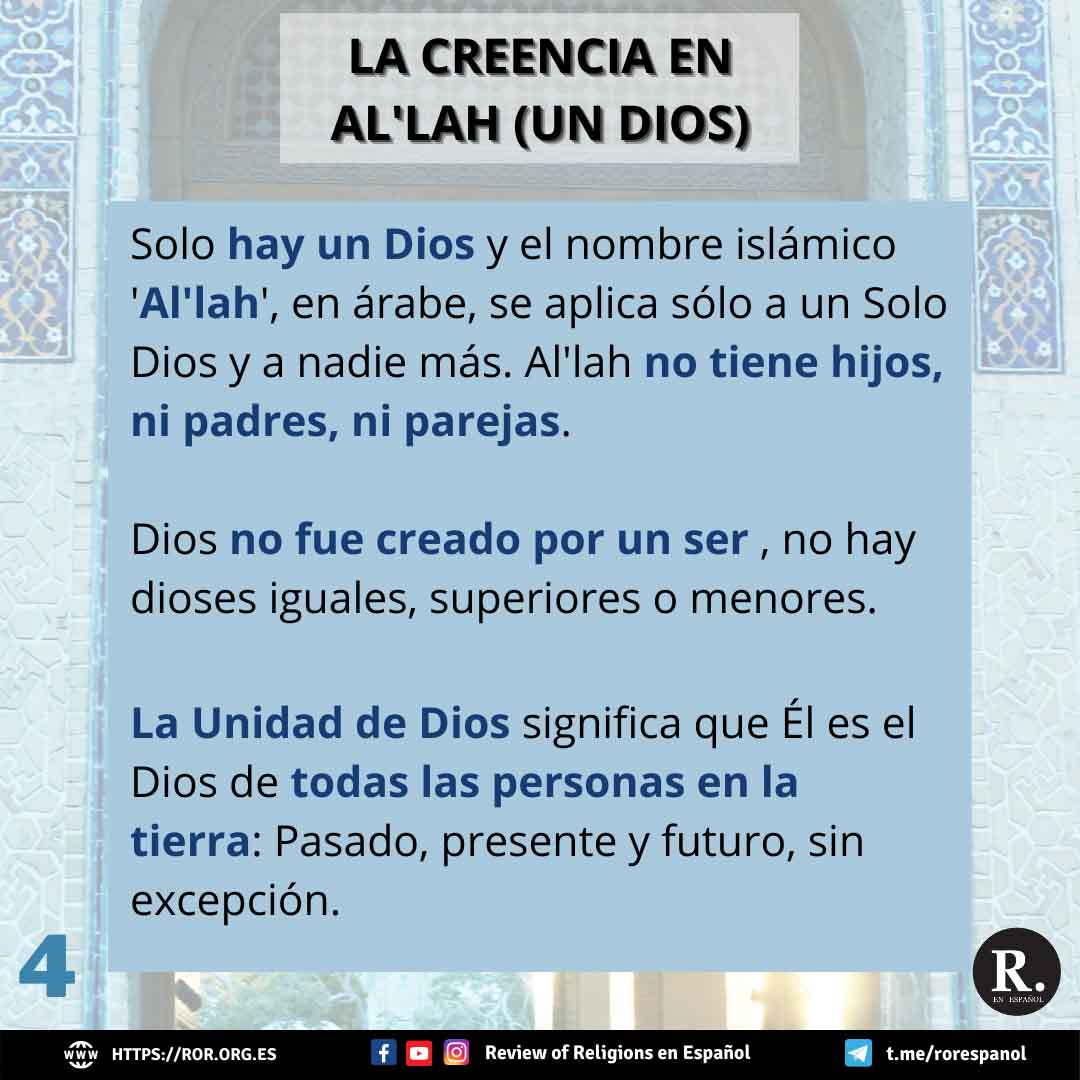 El primero artículo es la creencia en Al’lah. Al’lah es el nombre para Dios en el islam y árabe. Al’lah es único y no tiene coparticipes. No tiene hijos, padres ni parejas. Es perfecto y no tiene ninguna debilidad. El Corán enseña que Al’lah es el mismo Dios de la biblia y los profetas antiguos como Abraham, Moisés y Jesús.