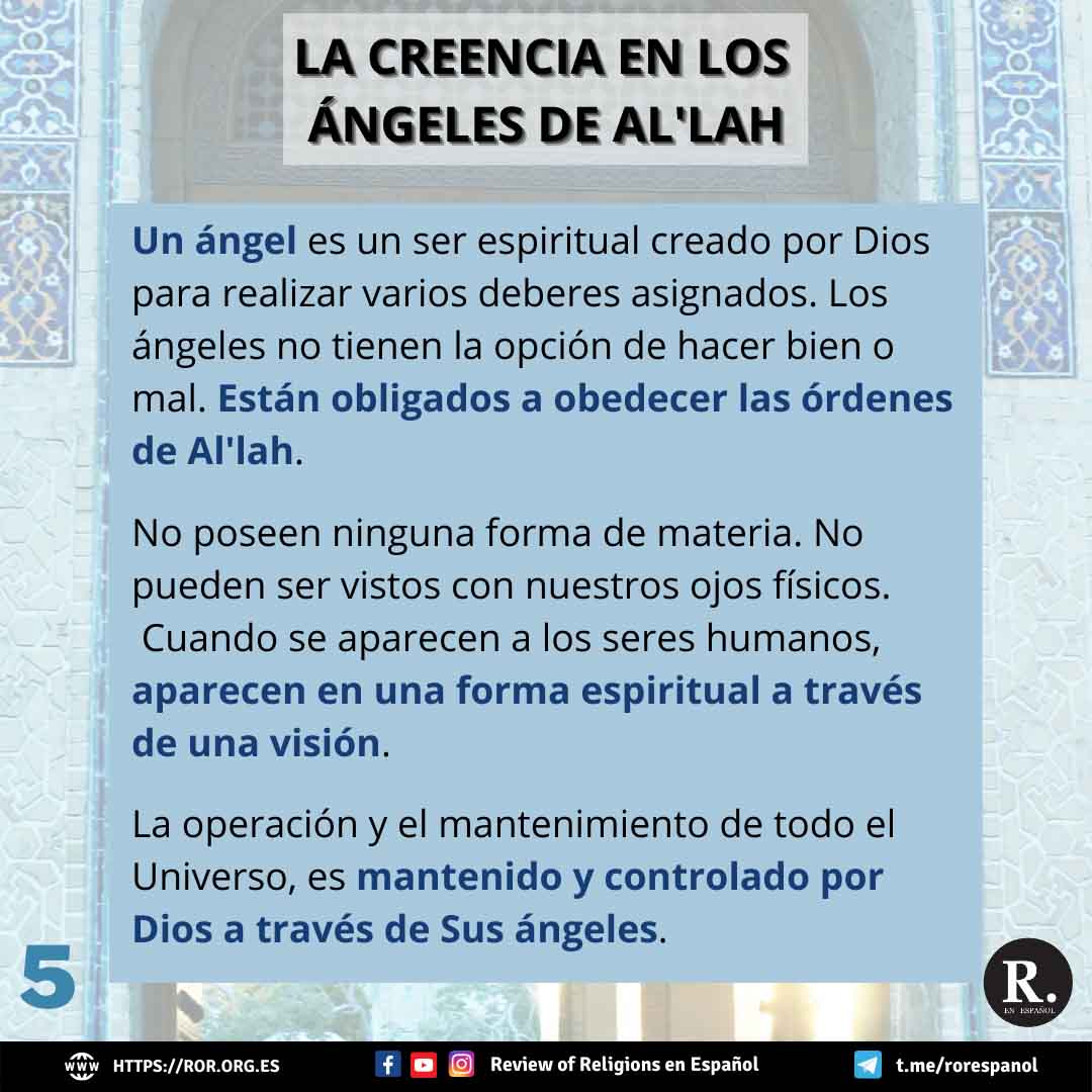 El segundo artículo es la creencia en los ángeles de Dios. Un ángel es un ser espiritual creado por Dios para realizar varios deberes asignados. A diferencia de los seres humanos, Dios no ha dado a los ángeles la opción de hacer bien o mal. Están obligados a obedecer las órdenes de Al’lah. Hay numerosos ángeles, pero no poseen ninguna forma de material fija. No pueden ser vistos con nuestros ojos físicos debido a nuestras facultades limitadas. Según el islam, la operación y el mantenimiento de todo el Universo, es mantenido y controlado por Dios a través de Sus ángeles.