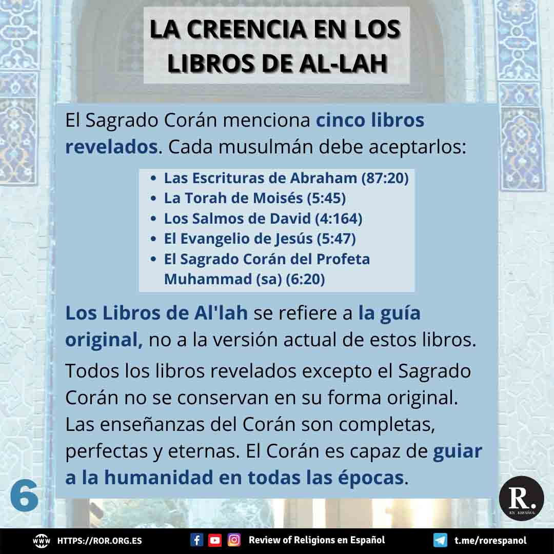 El tercer artículo es la creencia en los libros de Al’lah. A lo largo de la historia, Dios había estado guiando a la humanidad a través de sus profetas. A veces su mensaje era escrito y otras ; estos mensajes se conocen como los libros de Al’lah. Los musulmanes creen en el Sagrado Corán, además, es una obligación para los musulmanes aceptar los libros de Dios que fueron revelado a todos los profetas. Aunque el Corán menciona varios libros revelados de Dios, como la Torá y los Evangelios, la creencia de los musulmanes en los ‘Libros de Allah’ se refiere únicamente a la ‘guía original’ recibida por sus profetas, y no a la versión actual de estos libros.