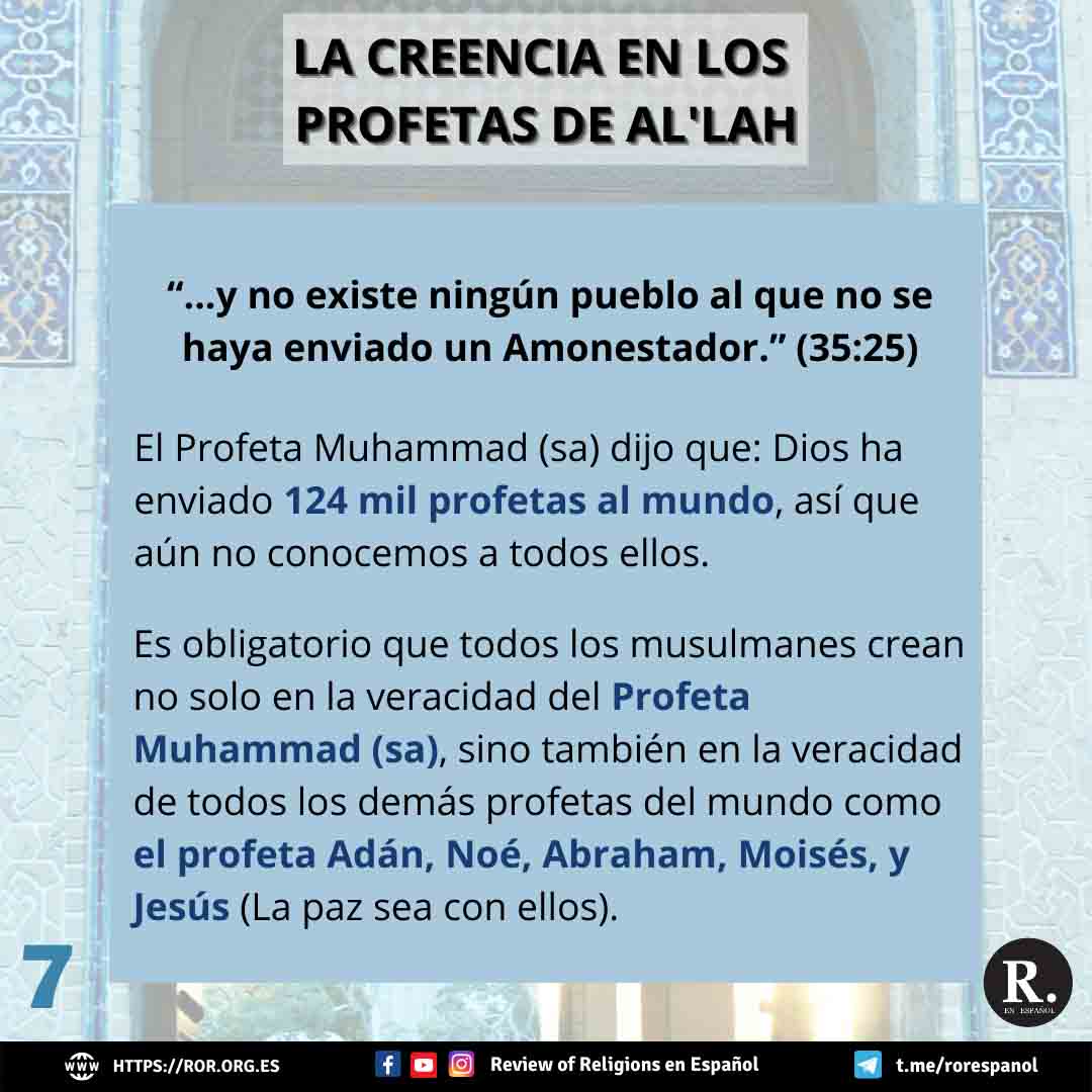 El cuarto artículo es la creencia en los profetas de Al’lah. Un profeta es una persona elegida por Dios para la reforma y la guía de de su pueblo. El Sagrado Corán utiliza dos palabras árabes para referirse a un profeta: Rasul y Nabi. El término Rasul significa “mensajero”, el término Nabi significa quien da noticias de grandes eventos desconocidos. El Profeta Muhammad (sa) dijo que Dios ha enviado 124 mil profetas al mundo, así que aún no conocemos todos ellos, creemos que cada pueblo ha recibido un profeta.
