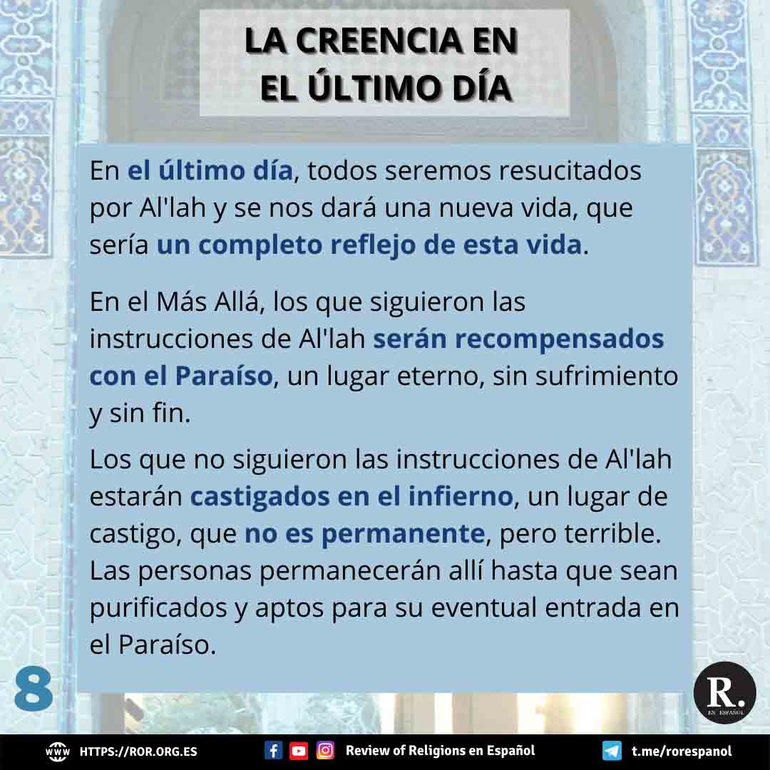 El quinto artículo es la creencia en el Último Día. Después de morir, todos seremos resucitados por Al’lah y se nos dará una nueva vida, que en realidad sería un completo reflejo de esta vida. Habrá un juzgamiento de todas las personas. Los que tenían creencias y acciones correctas entrarán en el paraíso, mientras que los que no tenían las creencias ni acciones correctas entrarán en el infierno.