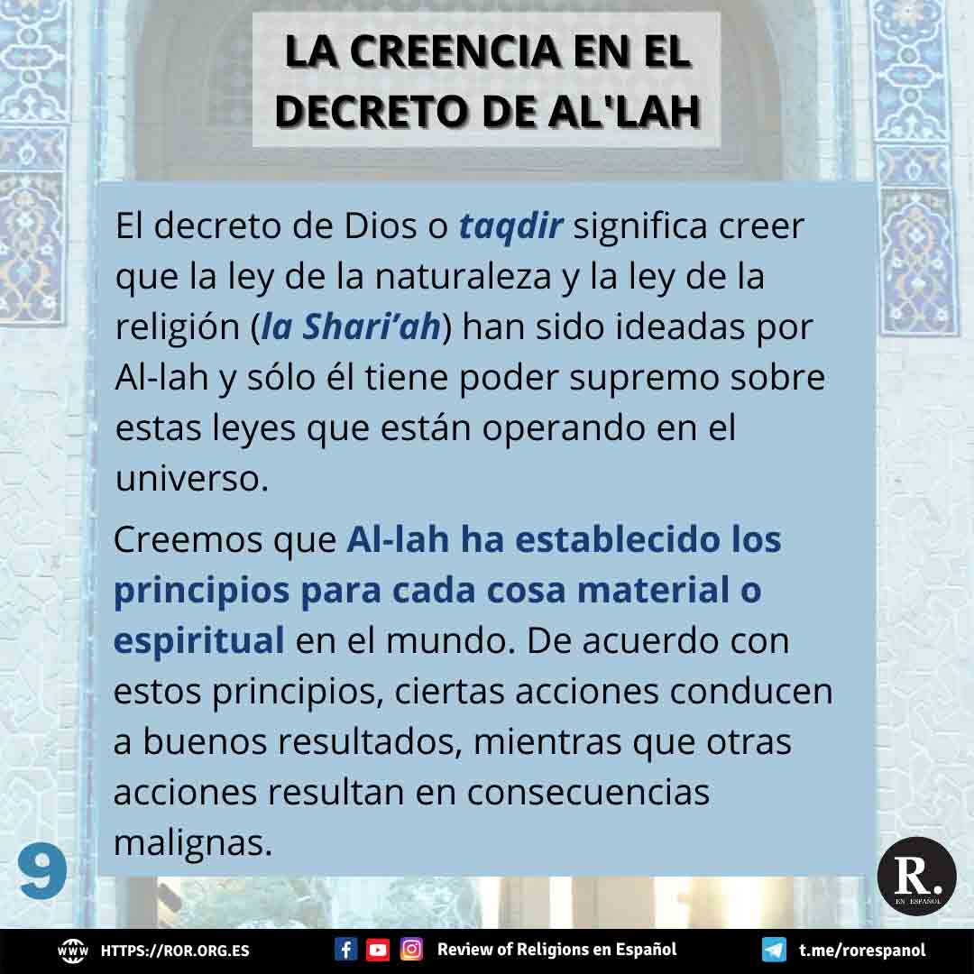 El sexto artículo es la creencia en el decreto de Dios. Al’lah ha establecido los principios para cada cosa material o espiritual en el mundo. De acuerdo con estos principios, ciertas acciones conducen a buenos resultados, mientras que otras acciones resultan en consecuencias malignas. Dios tiene un poder supremo sobre las leyes que ha creado. Bajo ciertas circunstancias, Dios produce cambios fenomenales en estas leyes, por el bien de Sus profetas y santos.