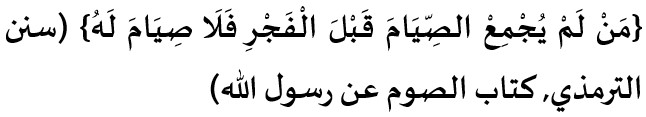 Ман лам южмиъ ас-сияма каблал-фажри фа-лаа сияма лаху, кимде-ким эрте таңдан мурунураак ниет кылбаса, анын орозосу эсептелбейт. («Термазий», Китаабус-Саум, Баабу лаа сияма ли ман-лам йаъзам минал-лайил).
