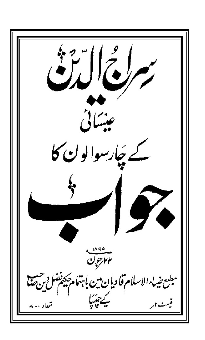 سیراجەددین، كە پیاوێكی مەسیحیە لە لاهۆر، چوار پرسیاری ناردووە بۆم بە ئامانجی وەڵامدانەوەیان، وە وەڵامی پرسیارەكانم داوەتەوە و بەلامەوە گونجاوە وەڵامەكەیان بڵاوبكەمەوە بۆ سوودی گشتی، وە لەخوارەوە چوار پرسیارەكە تۆماردەكەم لەگەڵ وەڵامەكانیاندا: