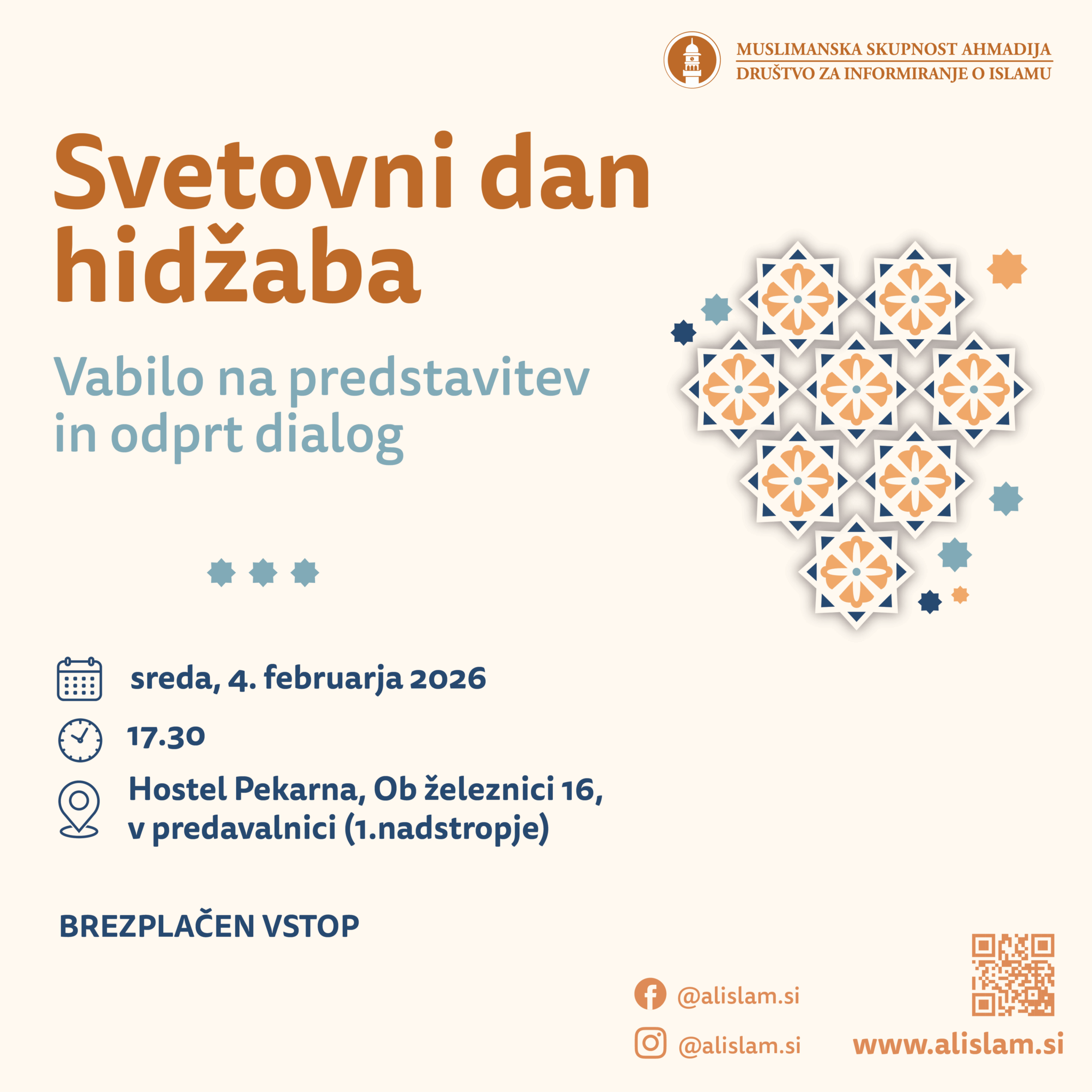 Muslimanska skupnost Ahmadija – Društvo za informiranje o islamu vas vljudno vabi na predstavitev ob svetovnem dnevu hidžaba, ki bo potekala v sredo, 4. februarja 2026, ob 17.30 v predavalnici (1. nadstropje) Hostel Pekarna, Ob železnici 16, 2000 Maribor.